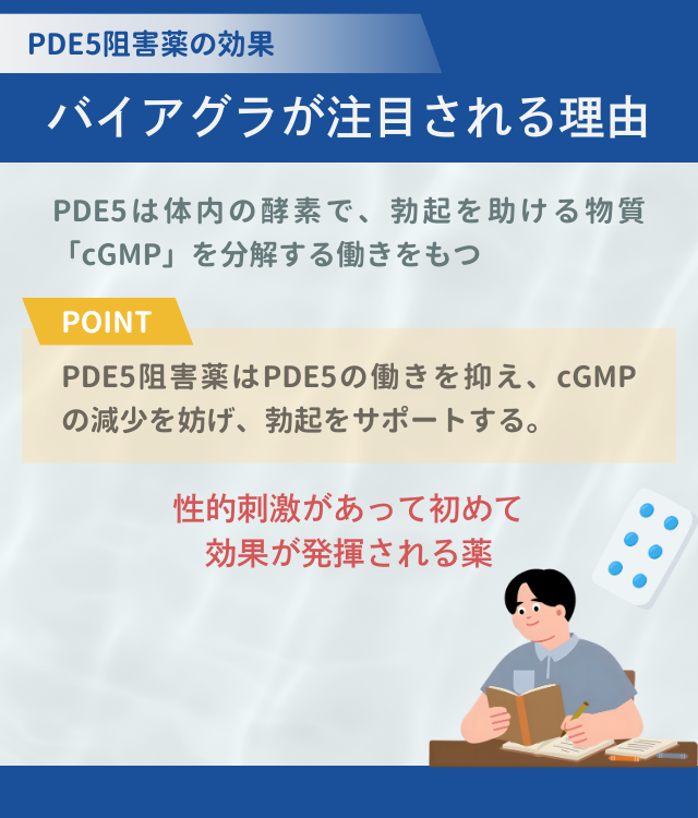 PDE5が強く働くとcGMPがすぐ減り、血が集まりにくくなって勃起しづらくなることがある。PDE5阻害薬はPDE5の働きを抑え、cGMPが減りにくい状態を保つことで勃起をサポートする。代表的な薬はバイアグラ、レビトラ、シアリスなどで、仕組みは同じだ。なお、性的刺激があって初めて効果が出る薬であり、飲んだだけで自然に勃起するわけではない。