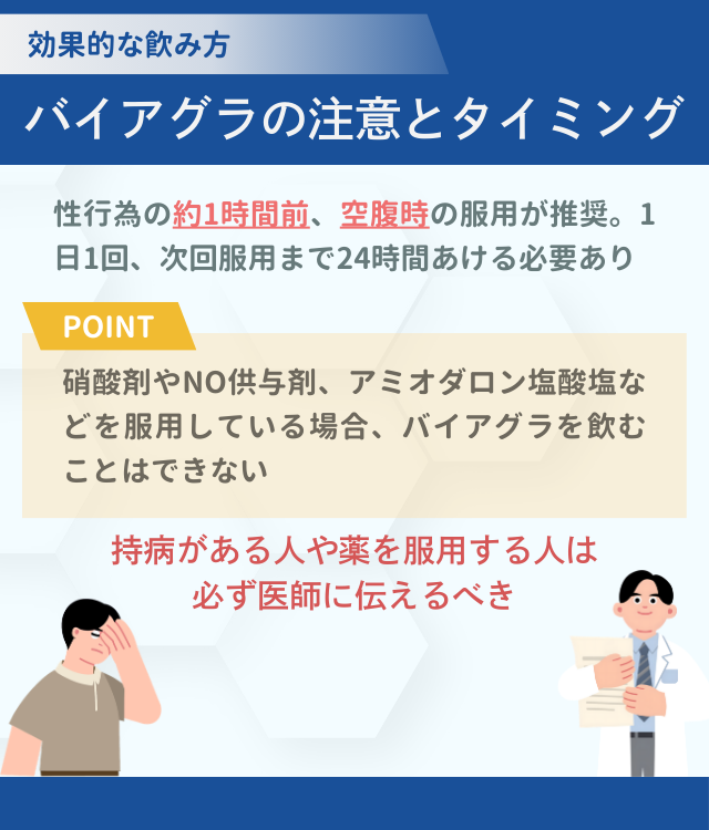 硝酸剤やNO供与剤、アミオダロン塩酸塩などを服用している場合、バイアグラを飲むことはできない。併用すると急激に血圧が低下し、命に関わる危険がある。
