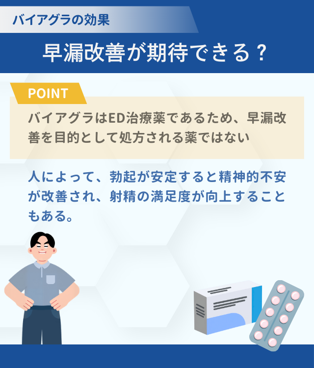ただし、人によっては早漏の改善を感じる場合がある。バイアグラは陰茎への血流を増やし、勃起を安定させる薬である。勃起が安定すると心理的な余裕が生まれやすくなり、焦りや不安が軽減される。その結果、射精のコントロールがしやすくなり、満足度が向上することがある。