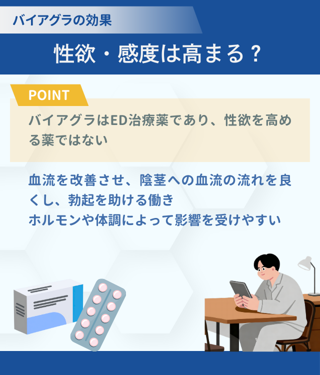 バイアグラはED治療薬であり、性欲を高める薬ではない。作用の中心は血流改善であり、陰茎への血液の流れを増やして勃起を助けるものである。そのため、性欲が強くなるという直接的な作用はない。