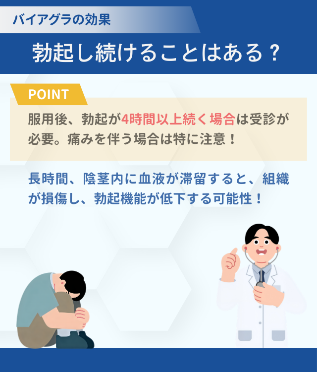 バイアグラ服用後に、勃起が長時間続くケースはまれではあるが報告されている。目安として、4時間以上勃起が続く場合は受診が必要とされている。特に6時間以上持続し、痛みを伴う場合は注意が必要である。