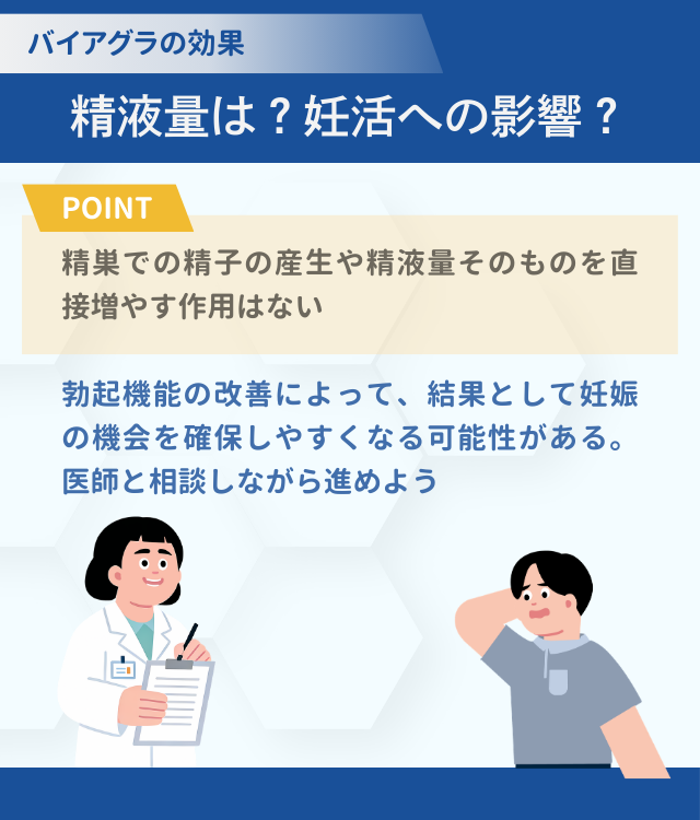 バイアグラは陰茎への血流を改善することで勃起をサポートする薬である。精巣での精子の産生や精液量そのものを直接増やす作用はない。